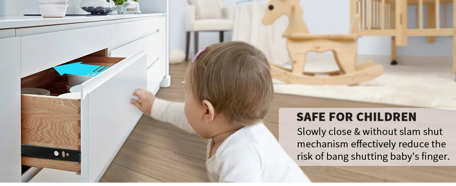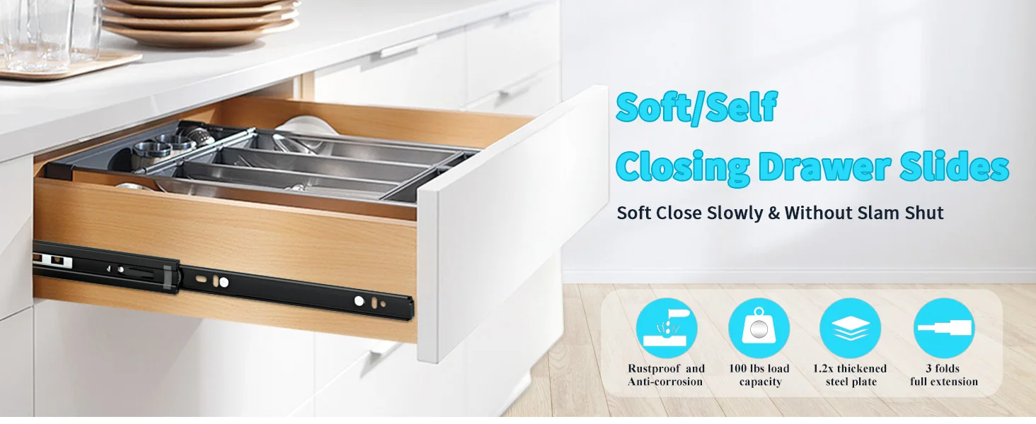 Extensión completa de 3 veces y desmontable 'La extensión completa de 3 veces ' permite que las diapositivas se extiendan por completo, que diseñan para extender su cajón a una posición abierta completa para que pueda acceder a cualquier cosa en el cajón sin alcanzar debajo del labio de su gabinete; Desmontable: hay una hebilla de plástico en la parte posterior del riel deslizante, al presionarla, la 3ra (la sección más estrecha) se puede separar, lo que significa que el cajón puede instalarse y separarse fácilmente por su voluntad;