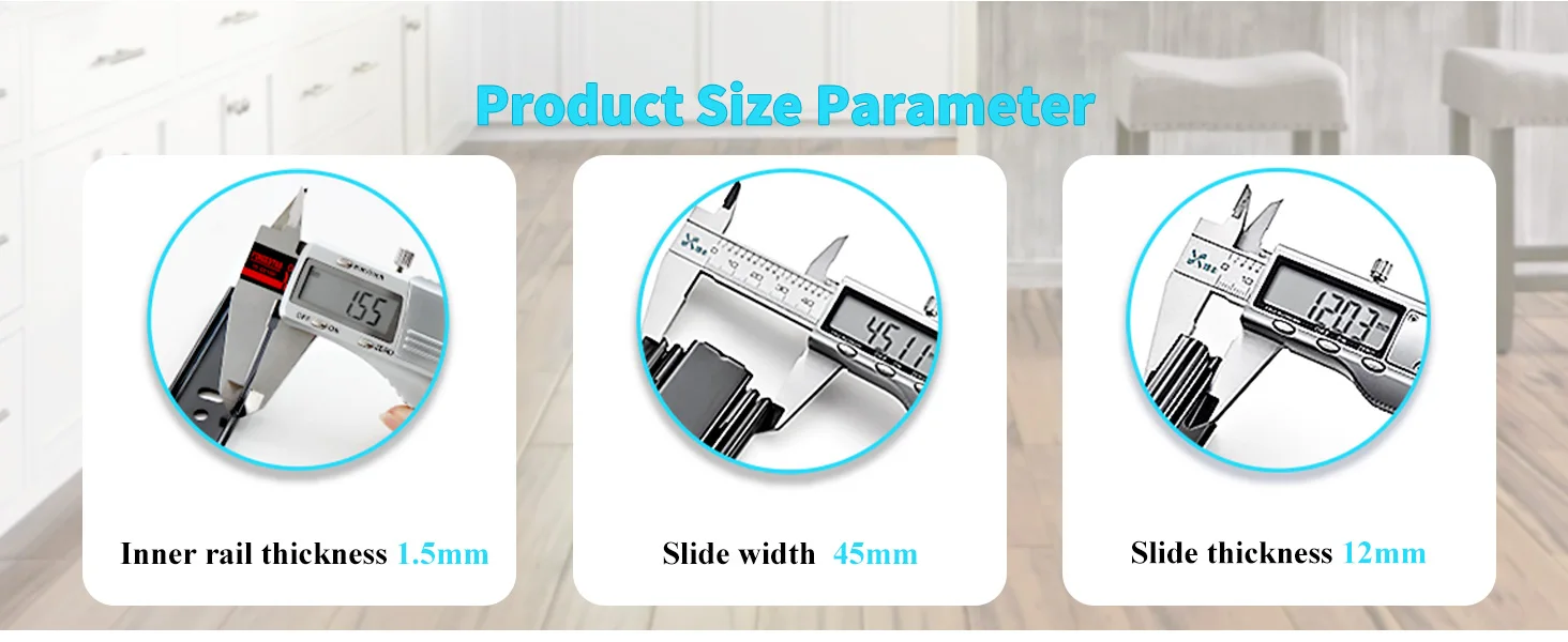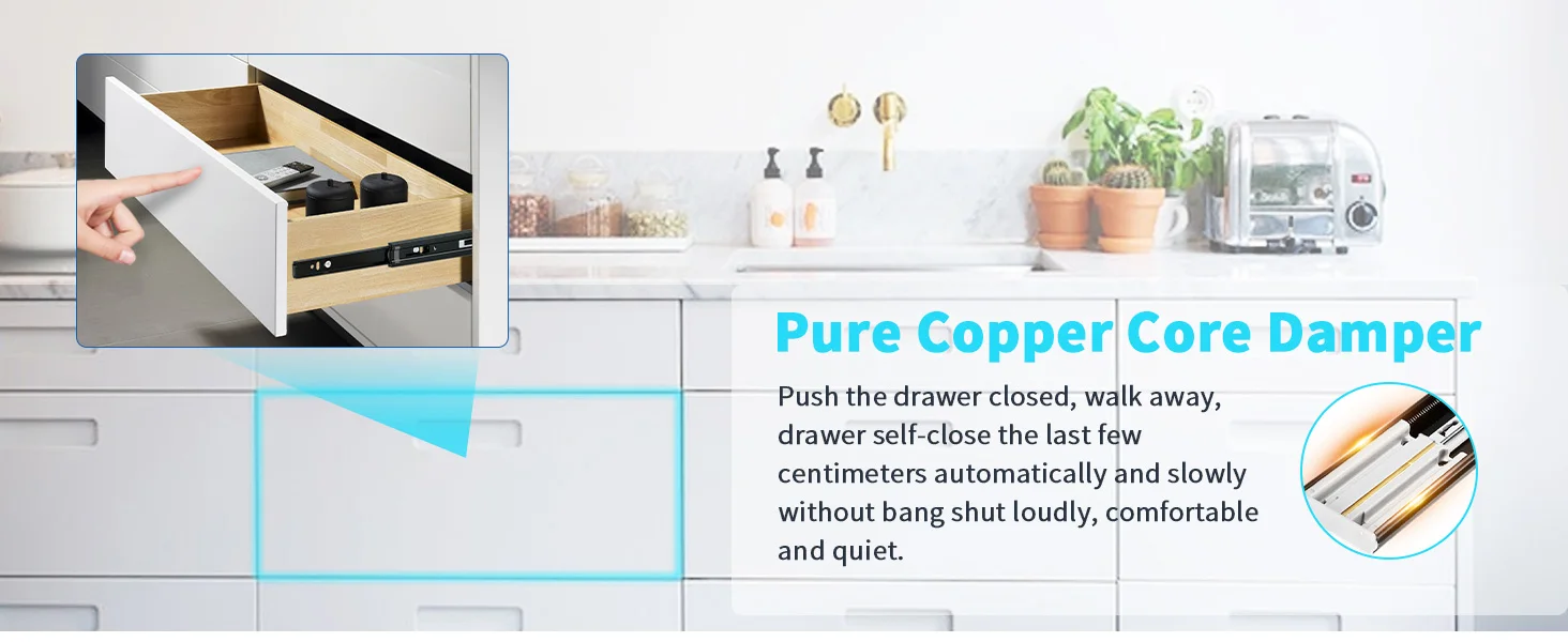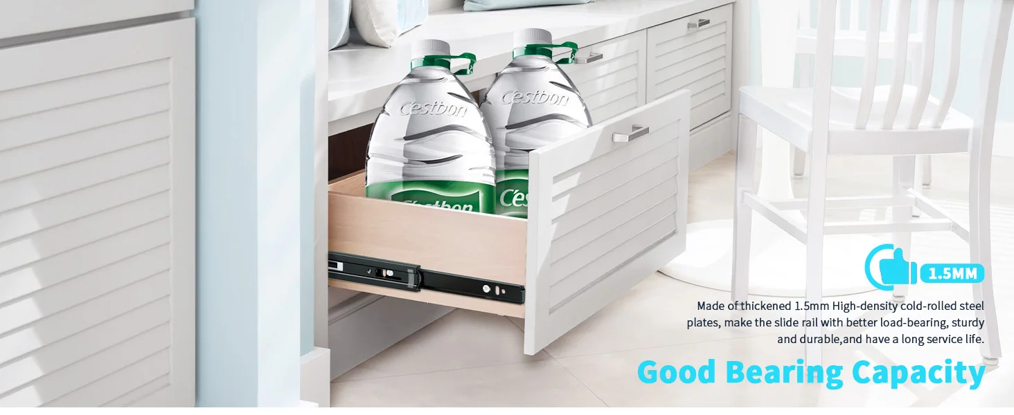 Capacidad de carga máxima: 100 lb Los portaobjetos están hechos de placas de acero de mano fría de alta densidad de 1,5 mm, mantendrá sus cajones estables y seguros incluso que transportan hasta 100 lb de artículos pesados, que toman 100,000 veces las pruebas de empuje de empuje cargado sin daños, la vida útil del riel de la toba podría ser de 30 años al menos.