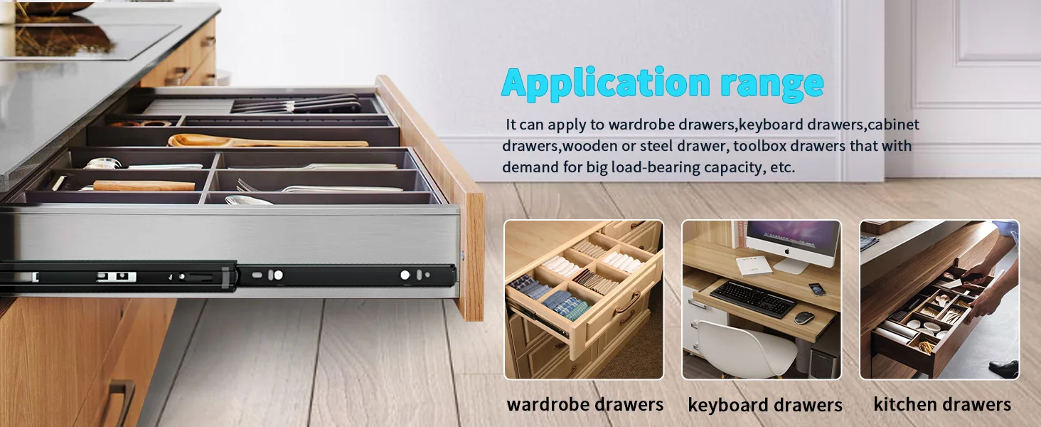 Rango de aplicaciones] El riel deslizante es adecuado para todo tipo de cajones caseros y muebles de oficina, puede aplicarse a los cajones de vestuario, los cajones de teclado, los cajones de gabinete, los cajones de madera o de acero, los cajones de la caja de herramientas que con la demanda de una gran capacidad de carga de carga, etc. Nuestro lema es 'Utilice la calidad de calidad, la vida de calidad en vivo.